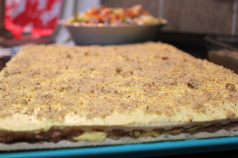 Za fil istopiti šećer i vanilu sa malo mlijeka pa popariti orahe. U hladan fil dodati umućen puter i rum i preliti ga preko hladnog tijesta. Posuti mljevenim orasima pa rezati na šanglice ili kocke.
